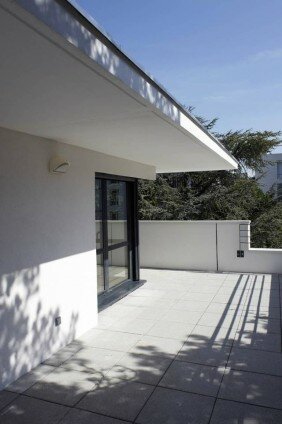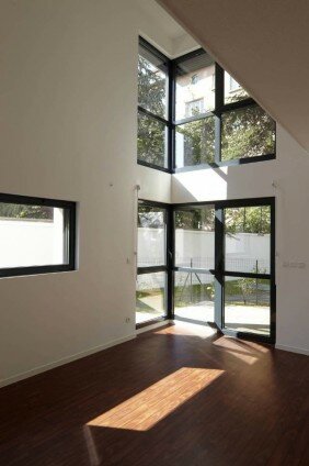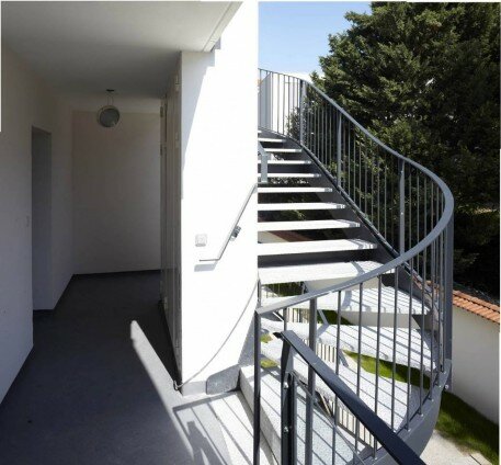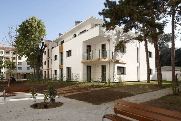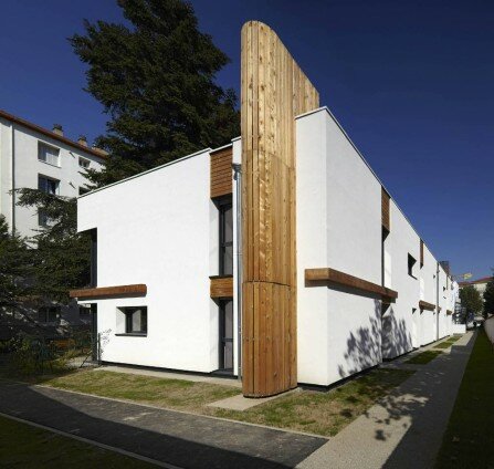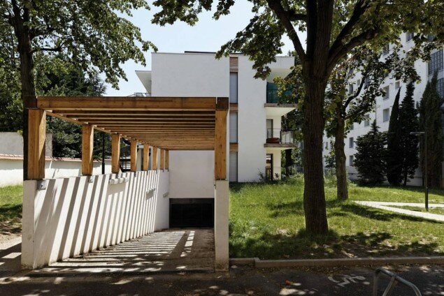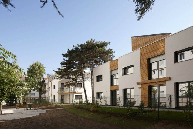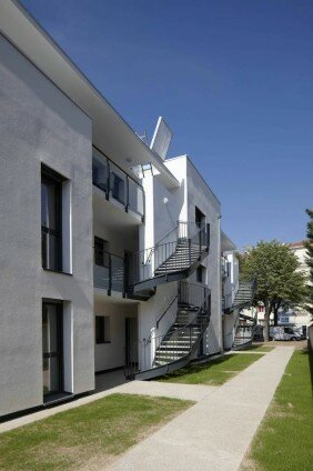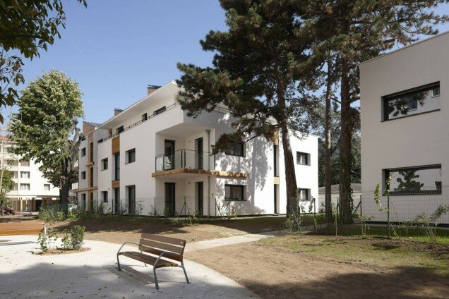 Parti architecturalA proximité du centre-ville, le quartier, constitué d'un tissu assez dense comprend des maisons individuelles, des immeubles collectifs et des bâtiments dédiés au tertiaire avec des toitures en sheds, autour desquels le végétal est préservé. Notre projet occupe un terrain comprenant un immeuble collectif à conserver et une rangée de garages à démolir. Il est implanté en cœur d'îlot et est constitué d’un programme de 15 logements inscrits dans une démarche HQE, et groupés en deux ensembles : un immeuble R+2 comprenant 11 logements et 4 maisons individuelles en bande en R+1, implantés de manière à ce qu’ils se fondent progressivement dans la nature. Ce projet a été traité de façon compacte pour répondre aux exigences HQE. L’immeuble en R+2 s’inspire des maisons bourgeoises ou des hôtels particuliers, et les maisons en bande rappellent le tissu pavillonnaire historique du quartier. Le bâtiment collectif se compose de deux volumes imbriqués de deux hauteurs différentes. Les maisons en bande sont rythmées par l’alternance des matériaux, murs et vitrages. Le rez-de-chaussée de l'ensemble est marqué en façade par une corniche en bois, matériau que l'on retrouve sur les coursives et la corniche du dernier niveau. Un même langage architectural et la simplicité de la colorimétrie des façades, constituée d'un revêtement minéral épais de teinte claire, permettent de mettre en relief la volumétrie structurée du projet. Chaque logement bénéficie d'une serre chaude et d'une double orientation est/ouest. Les séjours sont sur la façade ouest protégée par des plantations d’arbres à haute tige, et l’accès aux logements collectifs et aux maisons individuelles se fait du côté est. Des panneaux photovoltaïques sont disposés sur des pans inclinés en toiture, rappelant les sheds des bâtiments voisins. |