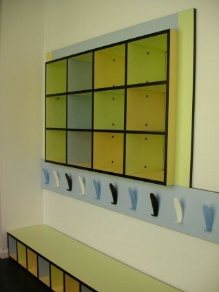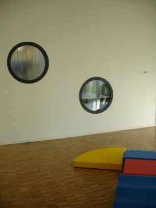Pour l’enfant qui commence à marcher son arrivée, en un tel lieu, lui permettra de découvrir, que le portillon d’entrée extérieur, est la marque d’une frontière affirmée entre les dangers de la rue où l’on doit tenir la main et le jardin où l’on n’est plus que sous le contrôle visuel. Le square d’entrée sera donc aux beaux jours un lieu d’échange et de convivialité entre les différents parents et l’équipe professionnelle. Dès son entrée, il découvrira une rue intérieure, lieu de ses divers déplacements tout au long de la journée, qui lui permettront de ponctuer ses différentes activités. L’éloignement de chaque lieu qu’il fréquentera de part et d’autre de l’espace professionnel central, en dehors de provoquer et d’organiser les déplacements vus ci-dessus, permettra d’assurer un isolement entre les différentes pièces dans le respect du rythme biologique et du besoin différencié de chaque enfant eu égard au calme et au sommeil. |