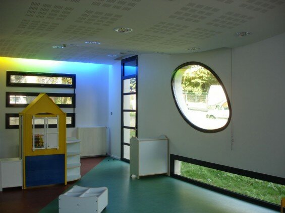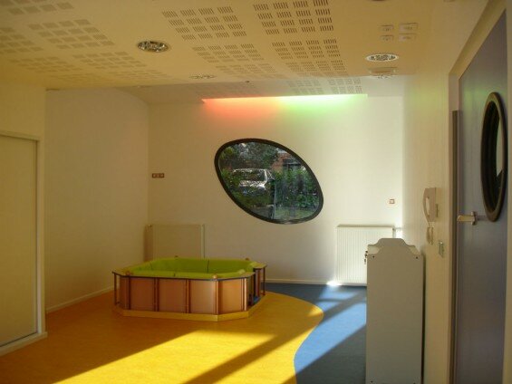 Parti architecturalPremier lieu de socialisation, la crèche peut également être le lieu de découverte des sens pour l'enfant. Le projet concerne un équipement conçu pour la petite enfance en appui du premier centre social de France, crée au lendemain de la première guerre mondiale. Un équipement conçu pour la toute petite enfance, de 2 mois ½ à 3 ans, qu’il soit destiné pour le joyeux bambin à un usage de garde permanente ou simplement occasionnelle, restera pour lui son premier lieu de socialisation, dans le sens de son apprentissage à une vie avec autrui, en dehors de son cocon familial, où il a tant l’habitude de régner. Là, il commencera à découvrir qu’il a des égaux, qu’il doit savoir attendre, partager, des êtres qu’il ne connaît pas, qu’il faudra apprendre à apprivoiser, comme le dit si bien Le Petit Prince de St. Exupéry. Lieu de vie, pour l’enfant dans lequel il va passer une partie importante de son quotidien ; ce lieu devra lui permettre de bâtir ses références, trouver son coin d’appropriation personnel. Lieu ludique de loisir pour d’autres, ce sera l’endroit où il se fera ses premiers amis, mais aussi l’endroit où il connaîtra ses premiers interdits, dictés par une autre personne qu’un membre de sa famille. C’est donc un lieu transitoire dans la vie de l’enfant, post-maison et pré-école maternelle, un lieu pédagogique, de découverte de l’espace qui devra être singulier , surprenant donc totalement différent de sa maison, dans le respect bien sûr de son échelle. Ce bâtiment doit être support à un apprentissage de sa découverte sensorielle :