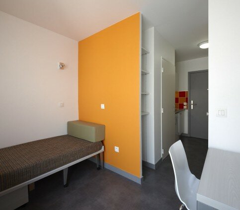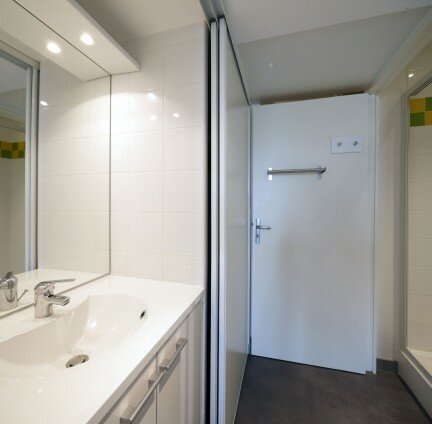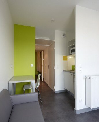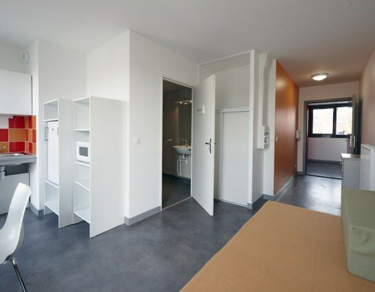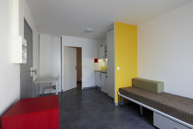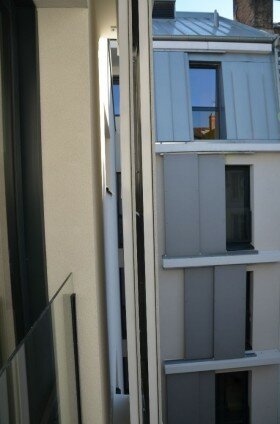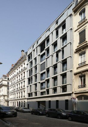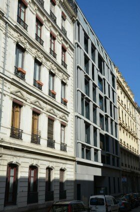 Parti architecturalUne porte ouverte pour des gens comme tout le monde, qui n’ont pas plus que quiconque le don d’ubiquité. Aux allures d’une grande maison de famille, un peu à l’image d’un hôtel particulier du quartier d’Ainay, une porte entrebâillée . Le foyer Majo-Condé ouvre la porte, tend la main à ces jeunes en quête d’autonomie. Le jeune habitant aura l’impression de ne pas rentrer dans une maison vide, non plus dans un immeuble anonyme, sans pour autant devoir subir le poids des questions, d’où viens-tu, où vas-tu, qu’il aura peut-être souhaiter fuir de chez sa famille. Espace généreux, le hall d’entrée, aux perspectives visuelles importantes et fuyantes sur un patio planté et naturellement éclairé, rappellera à la fois la perception d’une cour d’hôtel particulier, mais aussi l’image d’un hall de grand hôtel avec son pôle hobbies ; ils pourront être très fiers de leur résidence, qui leur permettra d’asseoir leur intégration sociale. Ces espaces communs seront le lieu propice aux échanges entre résidents, ou utilisateurs, ils favoriseront la mixité sociale et générationnelle, car accueillera également les personnes âgées du quartier. Quelle que soit sa surface, aussi exiguë soit elle, un logement doit pouvoir toujours en conserver son image et offrir sa fonctionnalité. Pour qu’il soit perçu comme tel, il doit pouvoir offrir la notion de pièces, inviter à passer de l’une à l’autre, faire découvrir des ambiances différentes. Chaque fonction doit pouvoir être identifiée et ne pas s’exercer en un même lieu. Toutefois chacun d’entre nous qu’il vive dans l’indigence ou l’opulence ne pourra être en un même instant en plusieurs lieux. Aussi comment offrir le maximum d’espace là où l’on se trouve. La baie de ce logement a été conçue de manière à proposer toute une variété de fenêtres ou de mises en scène. Une façade légère a été composée d’un panneau plein devant lequel viennent s’esquiver 2 volets coulissants, et de deux porte-fenêtres, l’une au vitrage translucide ou sérigraphié, l’autre au vitrage transparent. Ainsi une combinatoire de ces divers composants permettra de percevoir une baie double de séjour dont un voilage semblerait être tiré à demi afin de préserver l’intimité eu égard au proche voisinage, ou bien une baie de chambre avec voilage, ou encore une baie simple transparente de cuisine/coin repas. D’une rigueur semblable à l’architecture des mitoyens, cette façade pourra devenir dynamique et se recomposée à l’infini au gré de la vie de ses habitants, tant au niveau diurne que nocturne, qu’au fil des saisons. |