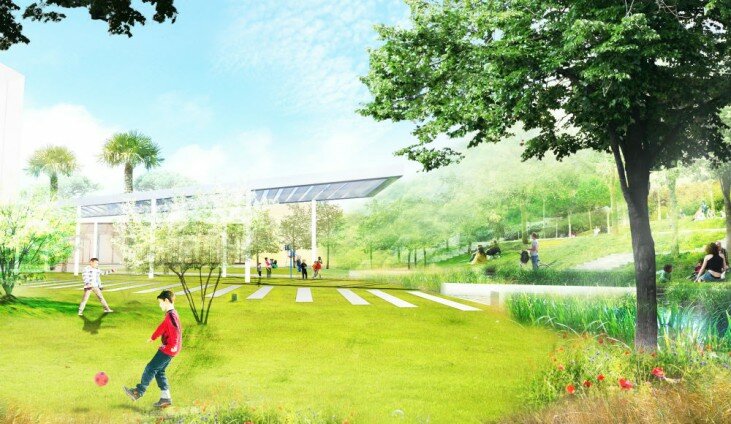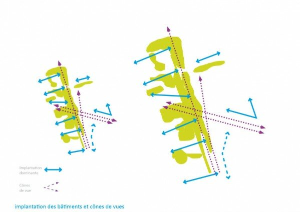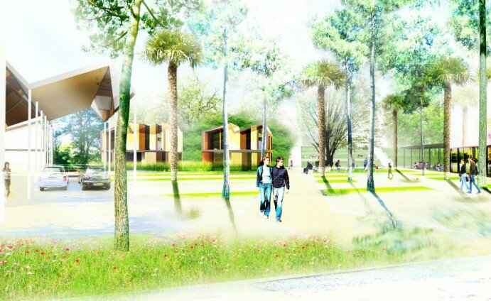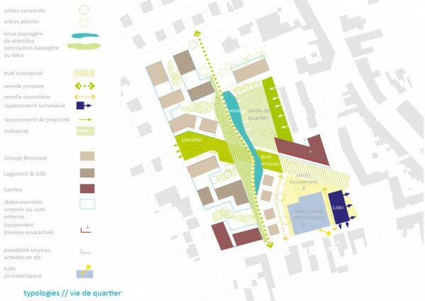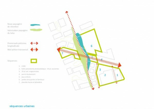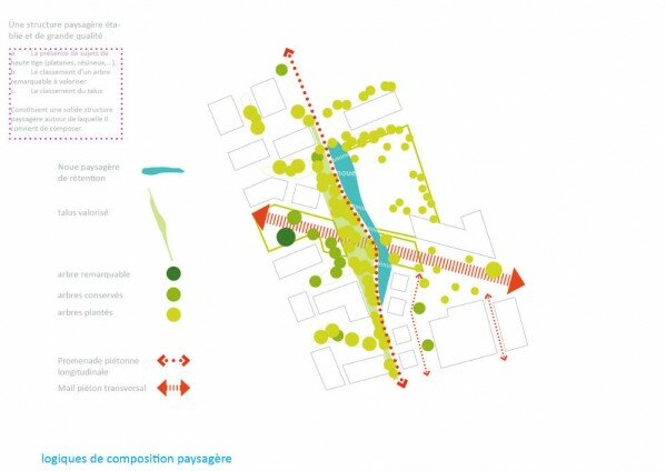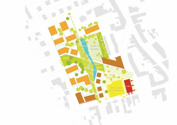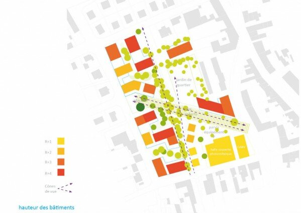 Parti architecturalUn écoquartier en plein centre historique, une nouvelle manière d'habiter la ville, une dépollution naturelle qui prépare l'avenir. Dans une notion importante de développement durable, le citoyen doit se réapproprier l’espace de proximité, dans ses pratiques, et privilégier alors les modes de déplacement doux. Favoriser la qualité de ce site, c’est le rendre perméable, en le maillant de cheminement doux d’Ouest en Est, afin de diminuer les contournements tout en enrichissant l’intérêt des déplacements piétons. Mettre en valeur le nouveau centre Boris Vian, par le traitement d’espaces publics d’accompagnement est indispensable dans le travail d’épaississement du centre bourg . Conservation et mise en valeur de la halle des « fêtes et cérémonies ». La dévêtir de son enveloppe, pour ne laisser que sa structure, pour accueillir le parking public en limitant son impact paysagé. La transformer en lieu culturel pour des activités extérieures. Sa verrière photovoltaïque en affirmera la dimension environnementale de cet éco-quartier. Un cœur d’îlot, tel un poumon vert, pour tous les habitants de ce lieu de vie Ce jardin intérieur de quartier prend appui à l’Ouest sur le talus végétalisé, et est décliné en son pied en zone humide de rétention. En limite Est, un ensemble de jardins familiaux sera décliné. Le jardin est décliné de façon à faire participer le végétal dans le choix des essences à sa dépollution. Valoriser le patrimoine végétal existant, pour installer délicatement la majeure partie des futurs bâtiments dans les interstices laissés par ces plantations. Construire aujourd’hui, c’est construire pour faire habiter demain. La volonté de générer un éco-quartier, nécessite d’organiser un plan masse en orientant le plus possible les bâtiments Nord / Sud, de manière à leur offrir à tous une double orientation traversante, tout en les faisant bénéficier d’apport solaires hivernaux, et de protections solaires simples en été, complétées naturellement par le fort potentiel végétal à feuillage caduc. Répondre à une clientèle en s’adaptant à ses difficultés et à l’évolution des modes de vie, donc d’habiter La compacité tant recherchée dans la nécessité de réduire les consommations énergétiques des bâtiments, se situe ici au sein de chaque plot, un concept de lotissement en 3D ou d’immeubles villas est développé. Concevoir un nouvel habitat de centre-ville en travaillant en travaillant sur l’évolutivité des logements et leur adaptabilité aux différents besoins de leurs habitants dans leurs différents stade de vie ou de leur structure familiale. |